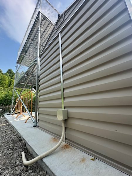 倉庫とやぐらの裏に穴を掘ってホースを埋めています。
