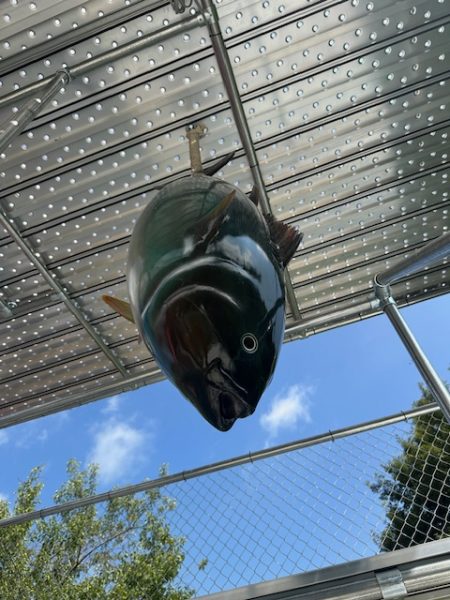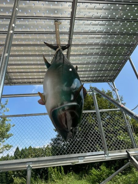 風であおられたマグロが、やぐらに当たらない位置を考えて固定してみました。