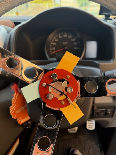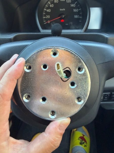 このオレンジ色の部分が、金属に触れるとホーンスイッチがオンになるので、