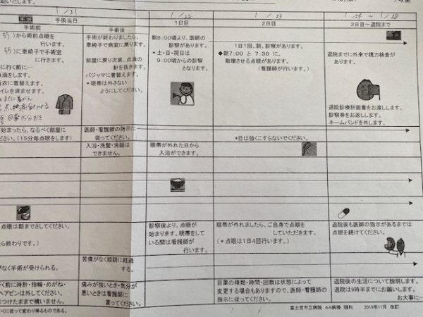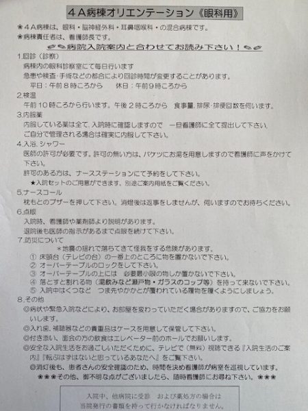 入院中は、点眼、食事の配膳、下げ膳すべて病院スタッフの方にしていただき、まさに、